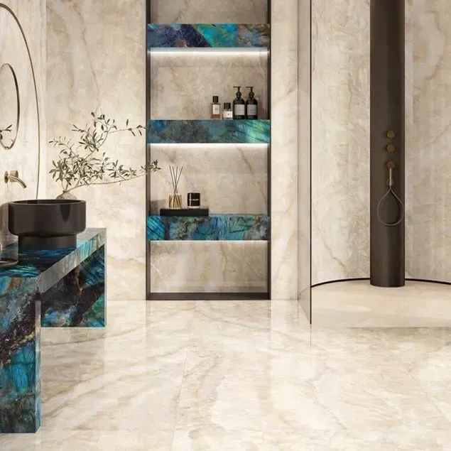 We carefully selected real precious stones, meticulously choosing the ideal gems for a unique creative programme. The project we brought to fruition explores three gemstones at the moment when light interacts with them, revealing all the splendour of their translucence or labradorescence. These unique slabs shape the personalities of distinctive, luxurious, characterful interiors, perfect both for magnificent works of architecture and for intimate, mysterious interiors, creating moods of beauty and glamour.